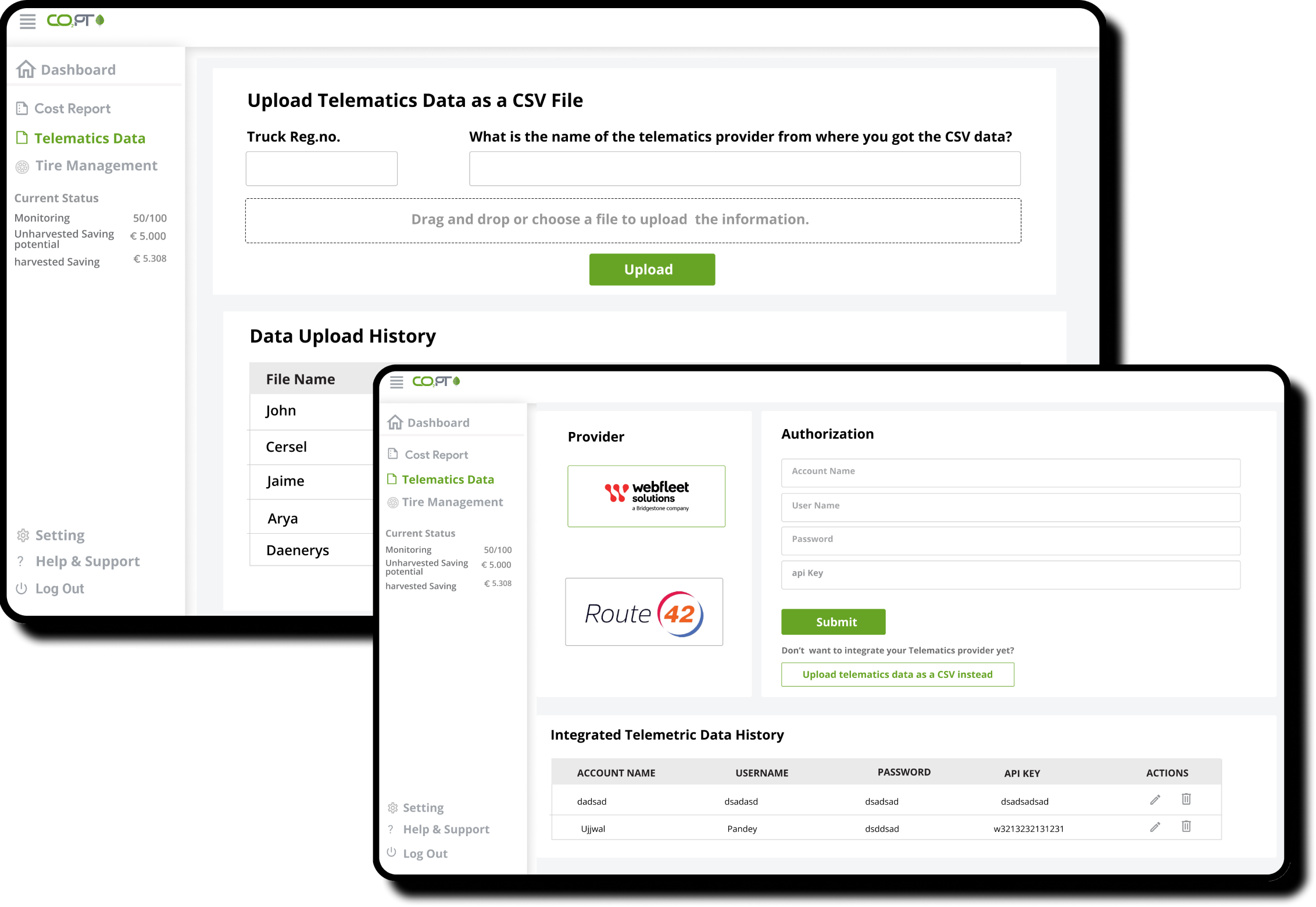 CO2OPT macht umständliche Tabellenkalkulationen und veraltete Software, die Transportunternehmen helfen sollen die Aufgaben zu automatisieren, überflüssig. Wir helfen dabei, das optimale Reifenangebot für die individuellen Einsatzprofile der Fahrzeuge zu ermitteln und über das vereinfachte Reifenmanagement die Effizienz des Fuhrparks nachhaltig zu steigern.