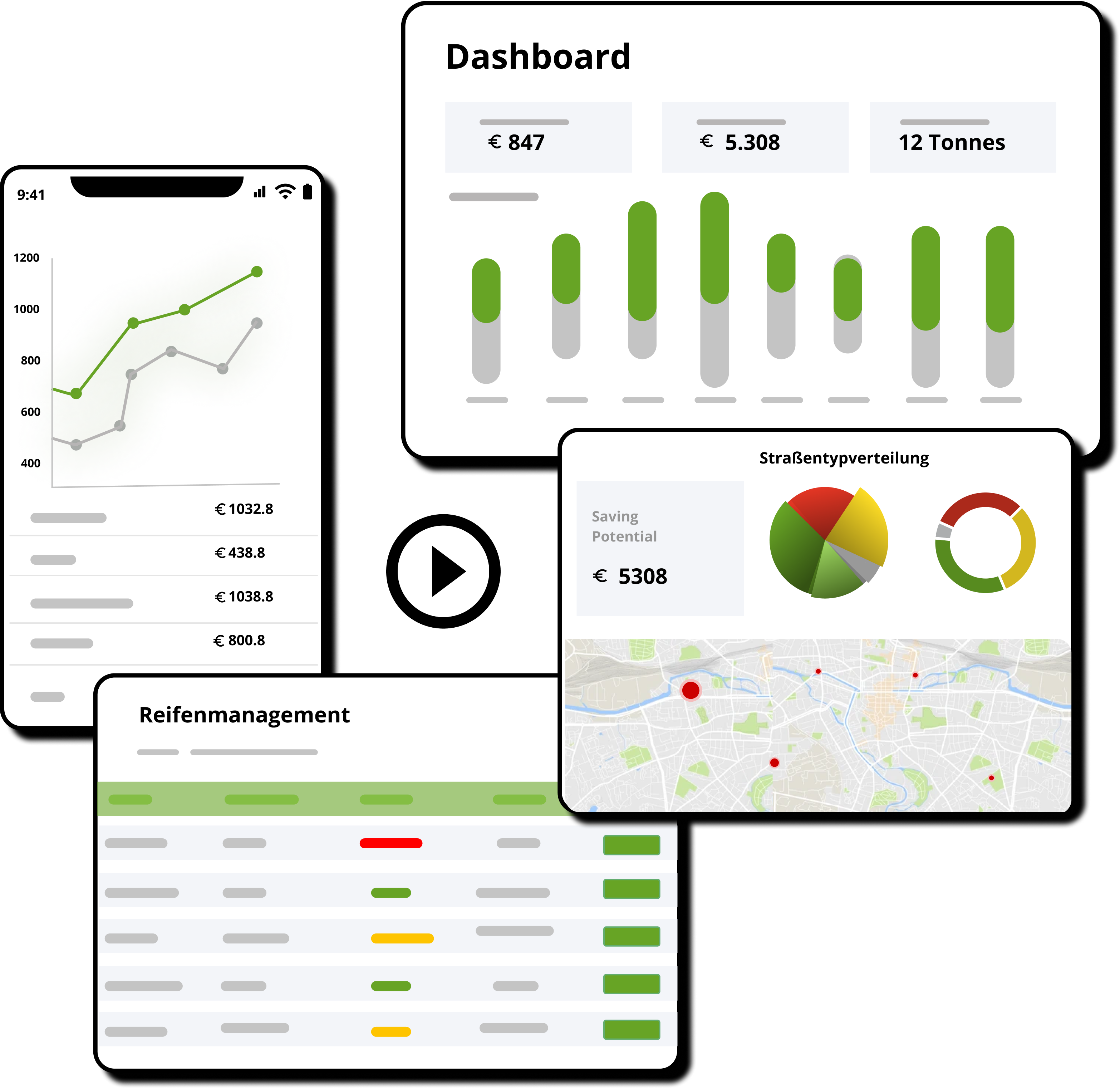Erhalten Sie mit nur wenigen Klicks einen digitalen Zwilling Ihres Fuhrparks, den Sie in dieser Form bisher noch nicht hatten. Auf Fakten basierende Vorschläge und Entscheidungen ermöglichen Ihnen, den Fuhrpark so zu steuern dass Sie bis zu 10% Kraftstoffkosten und CO2 Emissionen einsparen. Finden Sie Ihre optimale Reifenstrategie und steigern so die Effizienz Ihrer Fahrzeuge. Der für Sie beste Reifenpartner hilft Ihnen bei der Umsetzung. Auf unserer Plattform können Sie ganz einfach den Erfolg Ihres Reifenmanagements verfolgen.
